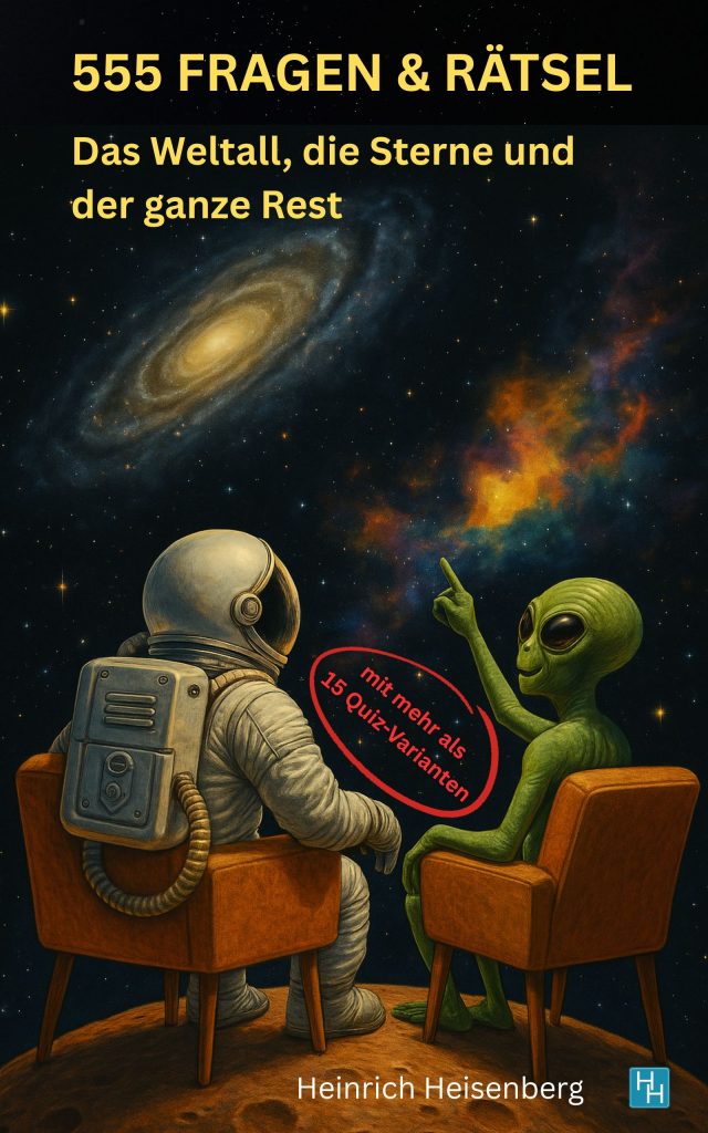 Von Urknall bis Wurmlöcher, von Messiers Himmels-Hits bis zu goldenen Planetenregen – hier warten 555 witzige, überraschende und garantiert staunenswerte Fragen samt Antworten. Mal leicht, mal knackig, immer mit einer Portion Aha-Wissen, das dich bei jeder Party glänzen lässt.